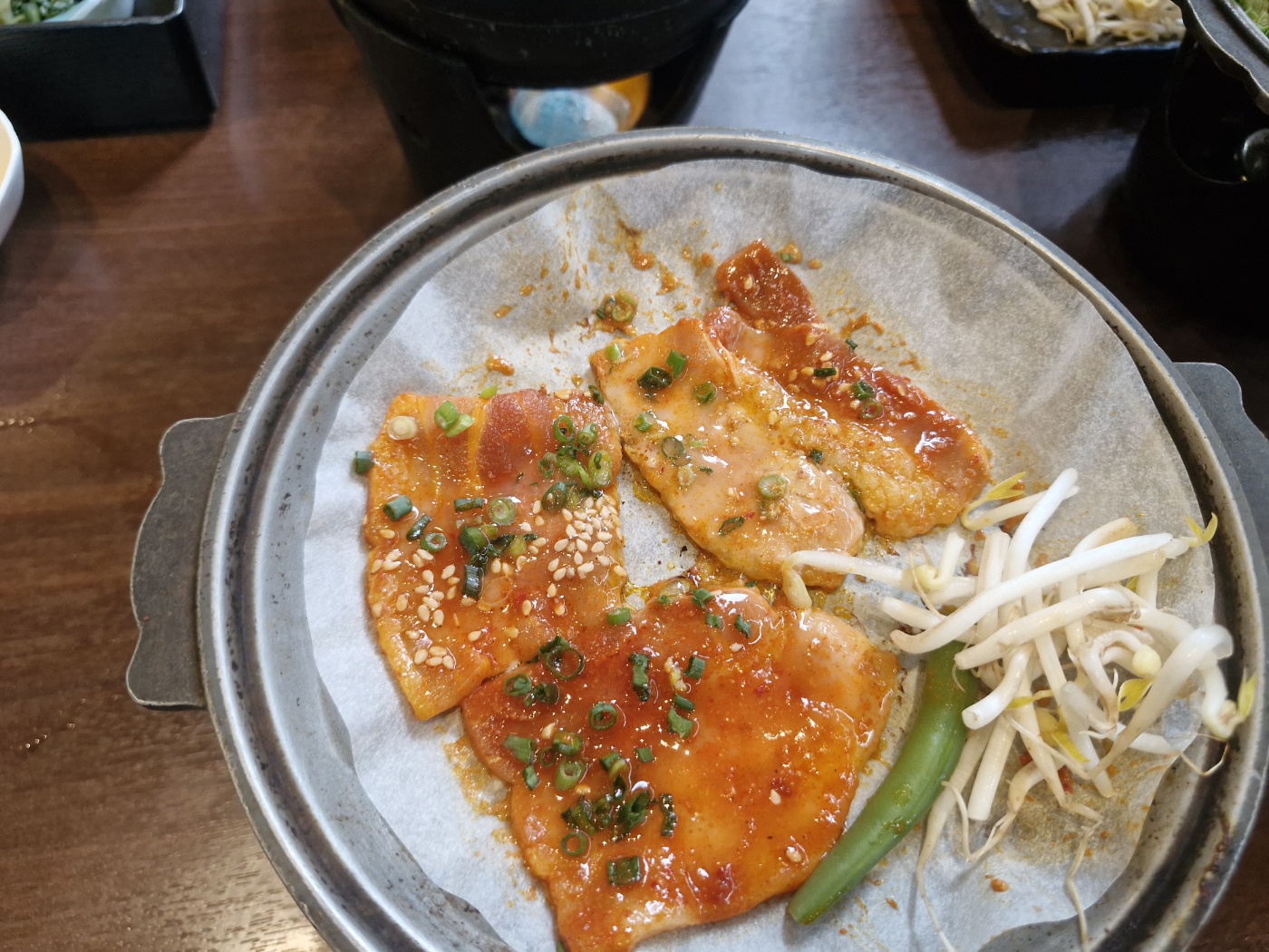 양념한 삼겹살구워 먹는 한국식 식단입니다.