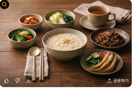 - 가을: 잣죽, 더덕무침, 은행볶음