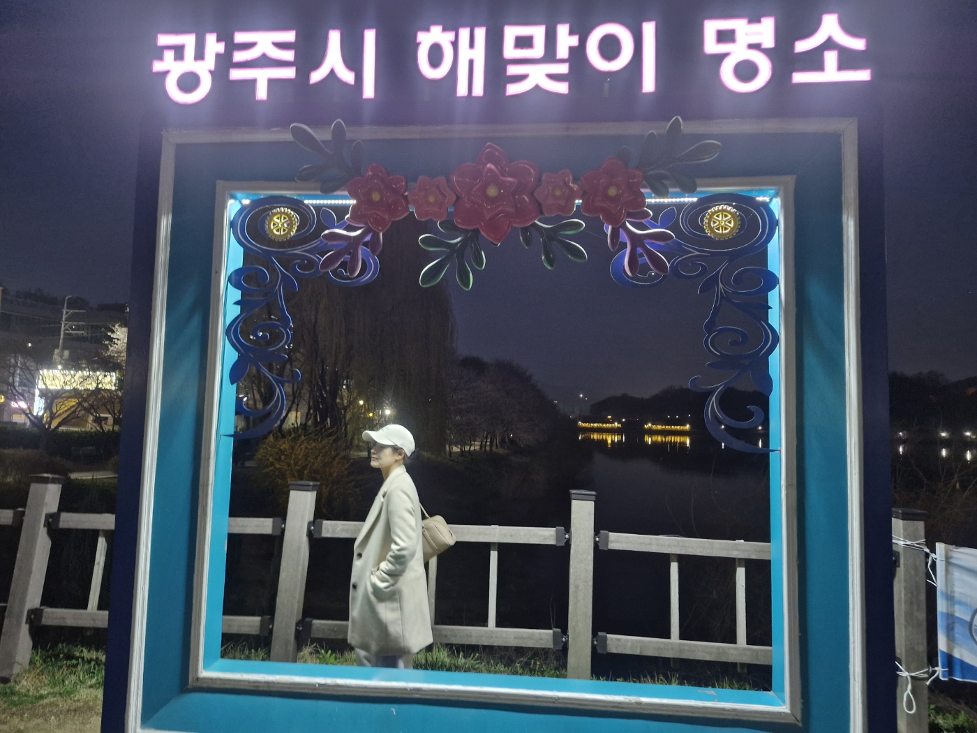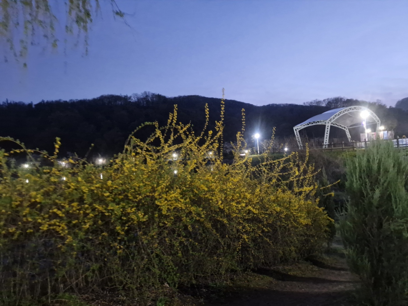 중대물빛공원 주말 밤 나들이 길 본홍빛 벚꽃 야경 ,호숫가에핀 노란 개나리꽃,해맞이 명소, 구름다리,호수